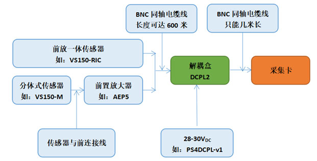 DCPL2解耦盒是專爲不能給前置放(fàng)大(dà)器供電的采集卡而設計的,其作(zuò)用就(jiù)是給前置放(fàng)大(dà)器提供電源的同時傳輸傳感器獲取的信号。由于前置放(fàng)大(dà)器的正常工(gōng)作(zuò)都(dōu)需要提供額外的電源,Vallen公司的采集卡都(dōu)設計有專門對前置放(fàng)大(dà)器供電的模塊,所以無需配置DCPL2解耦盒就(jiù)能使用,而市面上還有很多不是聲發射專用的采集卡,此類采集卡上沒有設計前置放(fàng)大(dà)器的供電模塊,而又想使用Vallen公司的前放(fàng)一體化傳感器或者分(fēn)體式傳感器時就(jiù)需要配置DCPL2解耦盒才能正常使用。